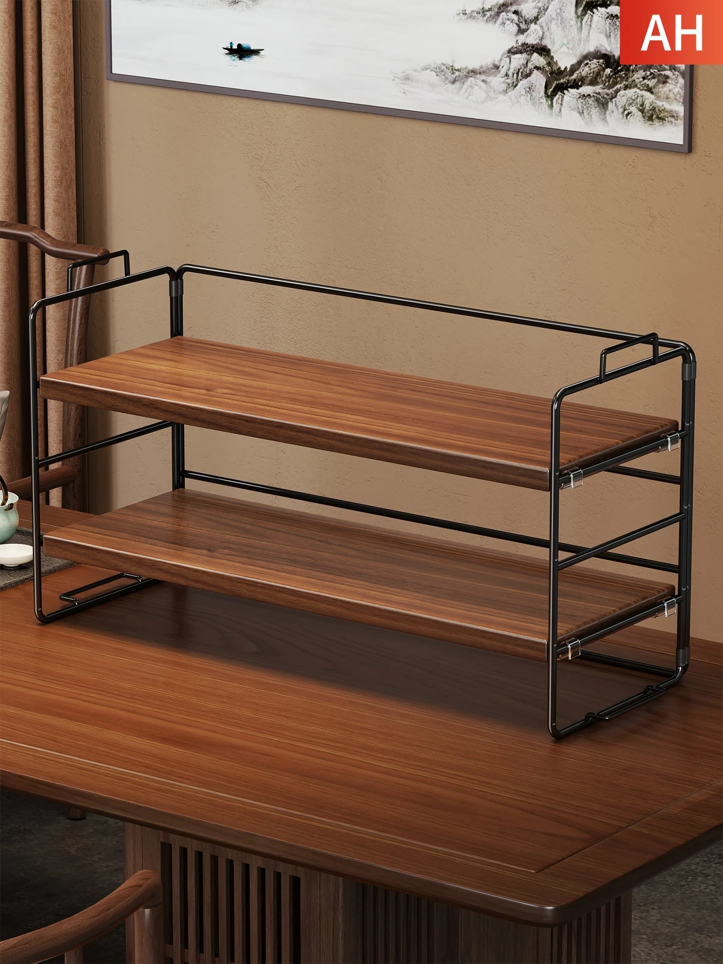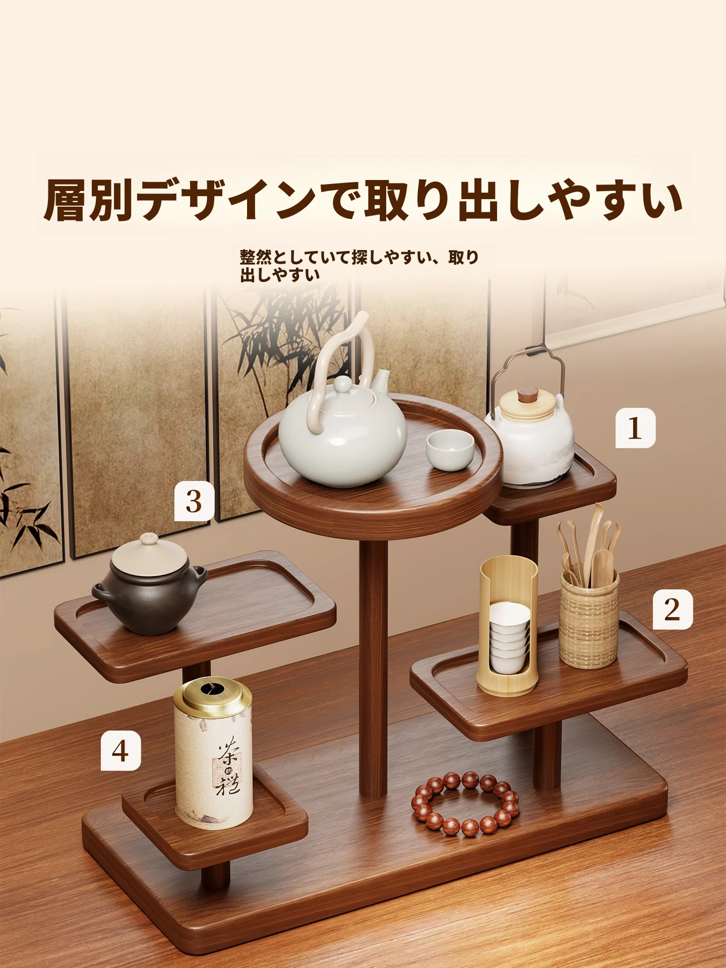レトロなデザインの小型ティーカップ収納ラック - 茶室にぴったりの紫砂壺ディスプレイスタンド!おしゃれな収納で、茶葉や茶具を美しく飾りましょう。あなたの茶の時間を特別に演出します!